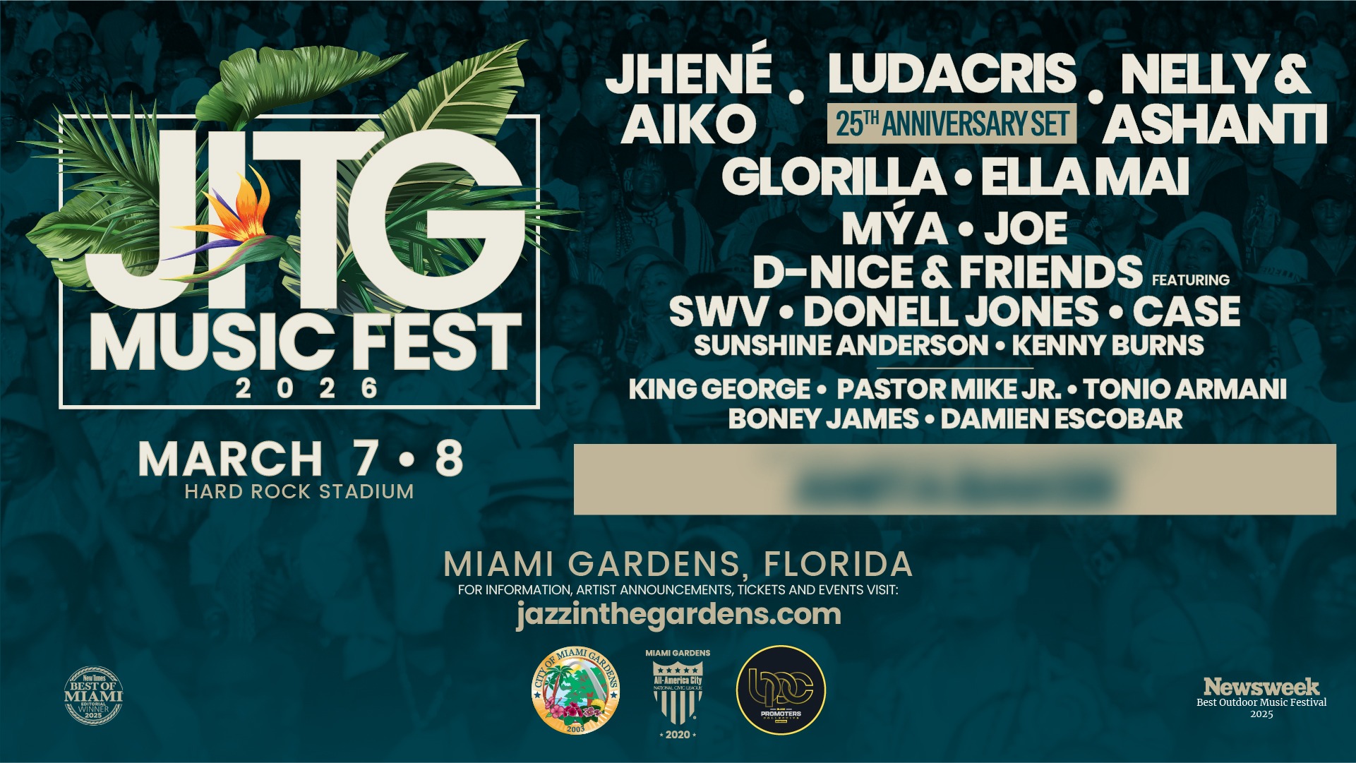 Now in its 19th year, the event returns to Miami Gardens’ Hard Rock Stadium in March. Jhené Aiko, Ludacris (a special 25th anniversary set) and Nelly and Ashanti will headline the 2026 edition of the Jazz in the Gardens Music Festival. Hosted by the City of Miami Gardens and produce